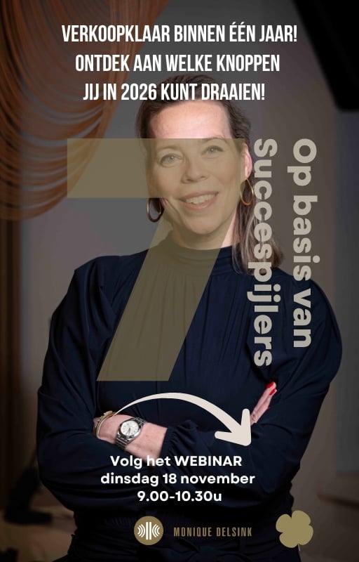 Of je nu binnenkort wilt verkopen of nog jaren doorgaat: een verkoopklaar bedrijf is meer waard, loopt soepeler en geeft jou als ondernemer meer rust en keuzevrijheid. In dit inspirerende webinar laat Monique Delsink je zien hoe je stap voor stap werkt aan een onderneming die klaar is voor de volgende fase. Je ontdekt waarom “verkoopklaar” niet alleen gaat over de eindstreep, maar juist over meer grip, groei en plezier onderweg. En over je persoonlijke pad.